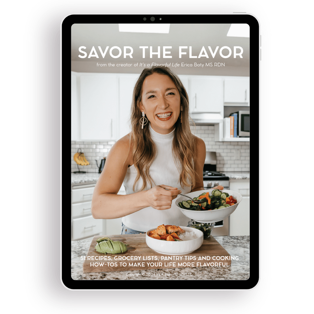 A collection of incredible recipes, countless kitchen tips, grocery lists and prep guides designed to make your life in the kitchen less stressful and more flavorful. Created and written by Erica Baty – registered dietitian, food fanatic and voice behind It’s a Flavorful Life.